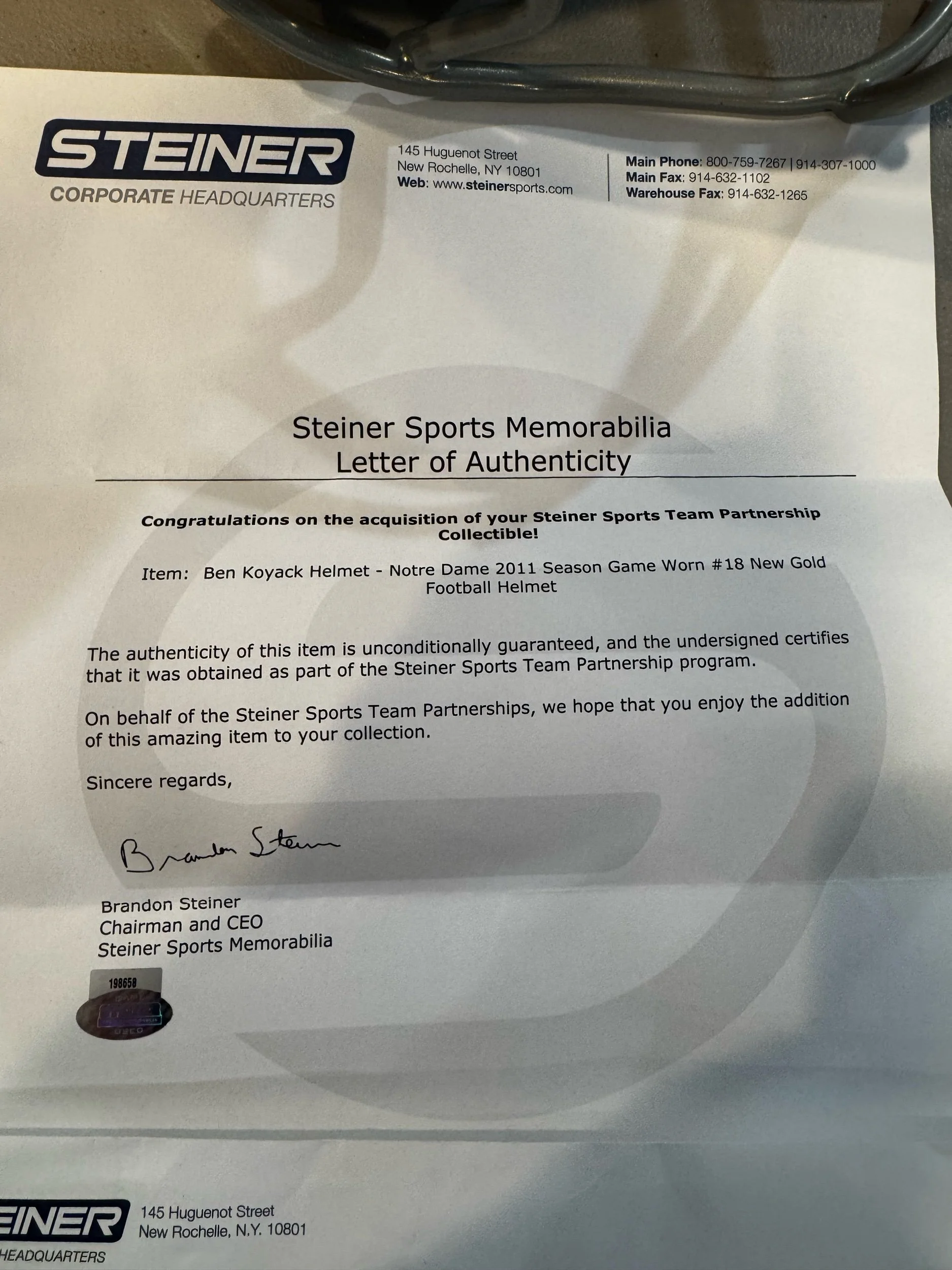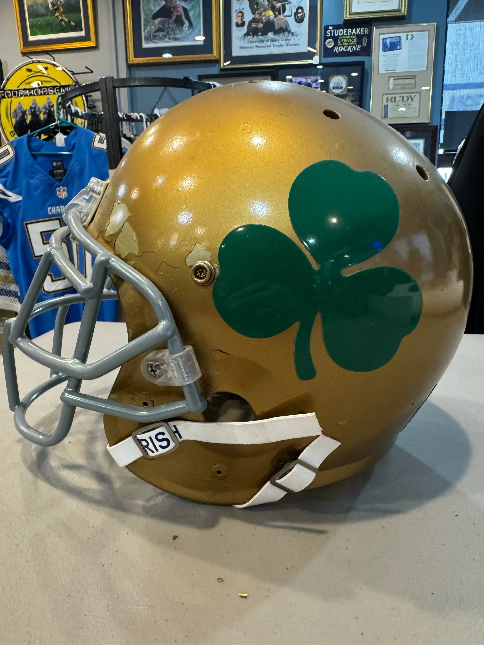 Each Notre Dame football helmet shines with a golden luster, reflecting a legacy of excellence and the unwavering spirit of the Fighting Irish. Online Store Categories: All Signed Notre Dame Full Sized Helmets Famous Notre Dame Artists Clothing Legends of The Game Featured Footballs Helmets Online Store All | Signed Notre Dame Full Sized Helmets | Famous Notre Dame Artists | Clothing | Legends of The Game | Featured | Footballs | Helmets | Harrison Smith Game Worn 2011 Notre Dame Football Under The Light Helmet with COA $8,250.00 Green Porcelain Locker Room Light removed from Notre Dame football Stadium during the expansion of 1996-97. $650.00 Ben Koyack Helmet - Notre Dame 2011 Season Game Worn #18 New Gold Football Helmet $1,800.00 Kapron Lewis-Moore Notre Dame Football helmet 2011 Season Game Worn #89 New gold $1,650.00 Notre Dame Football Vs Penn State Football Snow Bowl Poster signed Mirer and Brooks $350.00 Sold Out 1994 Artists For Athletes/Don Huber Lito signed Paul Hornung $125.00 16x20 Notre Dame football Ian Book Signed photos Beckett COA $135.00 Used Notre Dame Football Team issued JD Bertrand Practice shorts signed $150.00 Tommy Rees Jersey - Notre Dame 2011 Game Worn #11 Away Football Jersey Sale Price: $750.00 Original Price: $850.00 Sale Tommy Rees Jersey - Notre Dame 2011 Game Worn #11 Home Football Jersey (vS. USF) Sale Price: $750.00 Original Price: $900.00 Sale Robby Toma Jersey - NotreDame 2012-2013 Season Game Used White Jersey (9/01/2012 vs. Navy and 9/15/2012 vs. MSU) (M) Sale Price: $785.00 Original Price: $850.00 Sale #5 2009-2010 Notre Dame football game used home jersey $1,500.00 Michael Floyd #3 2008 Notre Dame Game Used White Football Jersey Sale Price: $785.00 Original Price: $850.00 Sale #9 2009-10 Notre Dame Game used Navy Football Jersey Sale Price: $775.00 Original Price: $850.00 Sale #5 2009-10 Notre Dame Game Used White Football Jersey (42) $1,500.00 #9 2009-10 Notre Dame Game Used Navy Football Jersey (46) Sale Price: $750.00 Original Price: $850.00 Sale Kapron Lewis-Moore#89 2009-10 Notre Dame Game used Navy Football Jersey Sale Price: $450.00 Original Price: $500.00 Sale Kapron Lewis-Moore #89 2010-11 Notre Dame Game Worn Navy Football Jersey (44) (Purdue) Sale Price: $435.00 Original Price: $500.00 Sale Golden Tate #23 2008 Notre Dame Game Used White Football Jersey w/ "157 Receptions, 26 TDs, 2707 Yds" Insc. (Size 40) $2,500.00 Michael Floyd #3 2008 Notre Dame Game Used Navy Football Jersey Sale Price: $785.00 Original Price: $850.00 Sale Dayne Crist #10 2010-2011 Notre Dame Game Worn Navy Football Jersey (42) (Michigan and Stanford) Sale Price: $600.00 Original Price: $775.00 Sale Lou Nix Jersey - Notre Dame 2012-2013 Season Game Used White Jersey (9/01/2012 vs. Navy) Sale Price: $725.00 Original Price: $800.00 Sale Tyler Eifert #80 2009-10 Notre Dame Game Used Navy Football Jersey Sale Price: $575.00 Original Price: $675.00 Sale Full Size Notre Dame Football White Panel ball signed Ara Parseghian Sale Price: $195.00 Original Price: $225.00 Sale Vintage Notre Dame Banner Signed Ara Parseghian Sale Price: $145.00 Original Price: $165.00 Sale Custom Under Armour Notre Dame football sideline coat 3XL $285.00 Ara Parseghian – 1964 FWAA Coach of the Year Plaque (Personal Collection) $850.00 Lou Holtz “The Timme Award” Touchdown Club Trophy – Personally Owned – With Letter of Authenticity $10,500.00 Notre Dame football Coach Ara Parseghian Personal collection Item $685.00 Notre Dame Football Coach Ara Parseghian Signed Golf displayed $225.00 1954 Pro Golf Tournament Trophy George Blanda And George Conner Chicago Bears $1,200.00 Notre Dame Mini helmet signed Ross Browner inscribed $245.00 Full Size Replica Notre Dame football helmet signed Rudy Ruettiger inscribed w COA $350.00 Game Used Notre Dame Football Signed Lou Holtz $485.00 Notre Dame Play Like A Champion Today metal sign Signed Laurie Wenger $30.00 Notre Dame football Mini helmet signed Jerome Bettis COA $350.00 Notre Dame Football Mini Helmet Signed Tim Brown COA $265.00 Limited /40 Notre Dame Football Mini Helmet Signed Reggie Brooks COA $185.00 Notre Dame Football Mini Helmet Signed Michael Mayer COA $145.00 Notre Dame Play Like A Champion Today Mini helmet Signed Laurie Wenger $45.00 Notre Dame Play Like A Champion Today Poster Signed Laurie Wenger $30.00 Notre Dame football mini helmet signed JD Bertrand $115.00 Notre Dame football mini helmet signed Stephon Tuitt JSA COA $85.00 Notre Dame football mini helmet signed Brian Kelly Beckett COA $125.00 Notre Dame football mini helmet signed Julius Jones JSA COA $125.00 Notre Dame football mini helmet signed Equanimeous St. Brown $95.00 Notre Dame football mini helmet signed Jaylen Sneed $125.00 Notre Dame football mini helmet signed Kyle Rudolph $115.00 Notre Dame football mini helmet signed Jimmy Clausen $120.00 Notre Dame football mini helmet signed Gabriel Rubio $85.00 Notre Dame football mini helmet signed Michael Floyd $125.00 VERY RARE: Antique Flesh-Colored Knute Rockne Bust $2,500.00 Bryant Young San Francisco 49ers Team Issued Football Jersey Signed Sale Price: $685.00 Original Price: $785.00 Sale NOTRE DAME HEAD COACH KNUTE ROCKNE LARGE BUST JERRY MCKENNA $12,500.00 Notre Dame Football Movie Rudy Script signed by Rudy Ruettiger $385.00 RARE 1966 NOTRE DAME FOOTBALL VS MICHIGAN STATE FOOTBALL TICKET/PROGRAM $875.00 RARE 2012 Notre Dame Football Wilson Football Dublin Ireland $1,500.00 Rare Framed Notre Dame Four Horsemen Signatures Crowley, Layden, Miller, Stuhldreher. Grantland Rice $5,750.00 Seven Notre Dame Heisman trophy winners ballots $1,250.00 Use team issued Notre Dame baseball cleats, and new gloves $55.00 Used team issue, Notre Dame baseball Bryce Harper under Armour cleats, and New gloves $55.00 Team Issued Notre Dame Football Home Jersey #16 $450.00 Team Issued Notre Dame Football Home Jersey #80 $475.00 2010 Team Issued Notre Dame Football Home Jersey $300.00 Limited Notre Dame football cooperstown Bear. Sale P