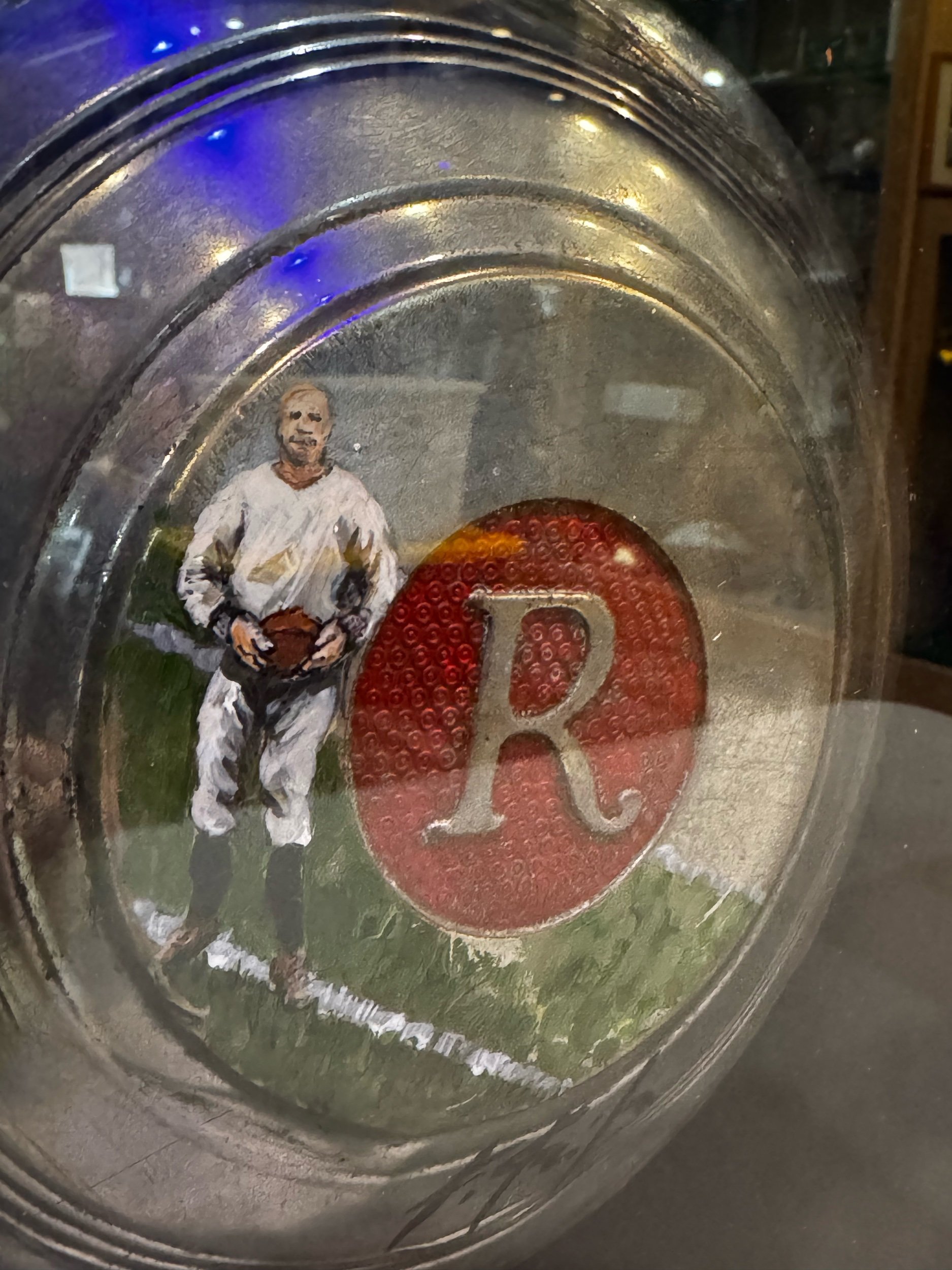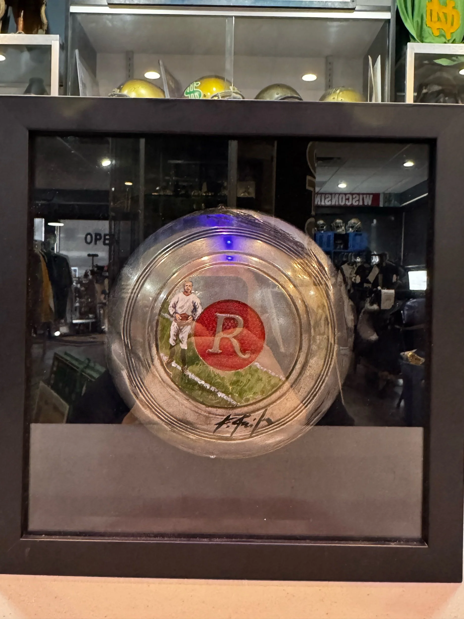 Rare unique Knute Rockne Endorsed Hubcap for the Studebaker Rockne 1932 painted Kathleen Keifer. Rockne endorsed hubcaps are hard to find. Painted on the hubcap is an image of former Notre Dame football Coach Knute Rockne. Frame is 11x11 inches.