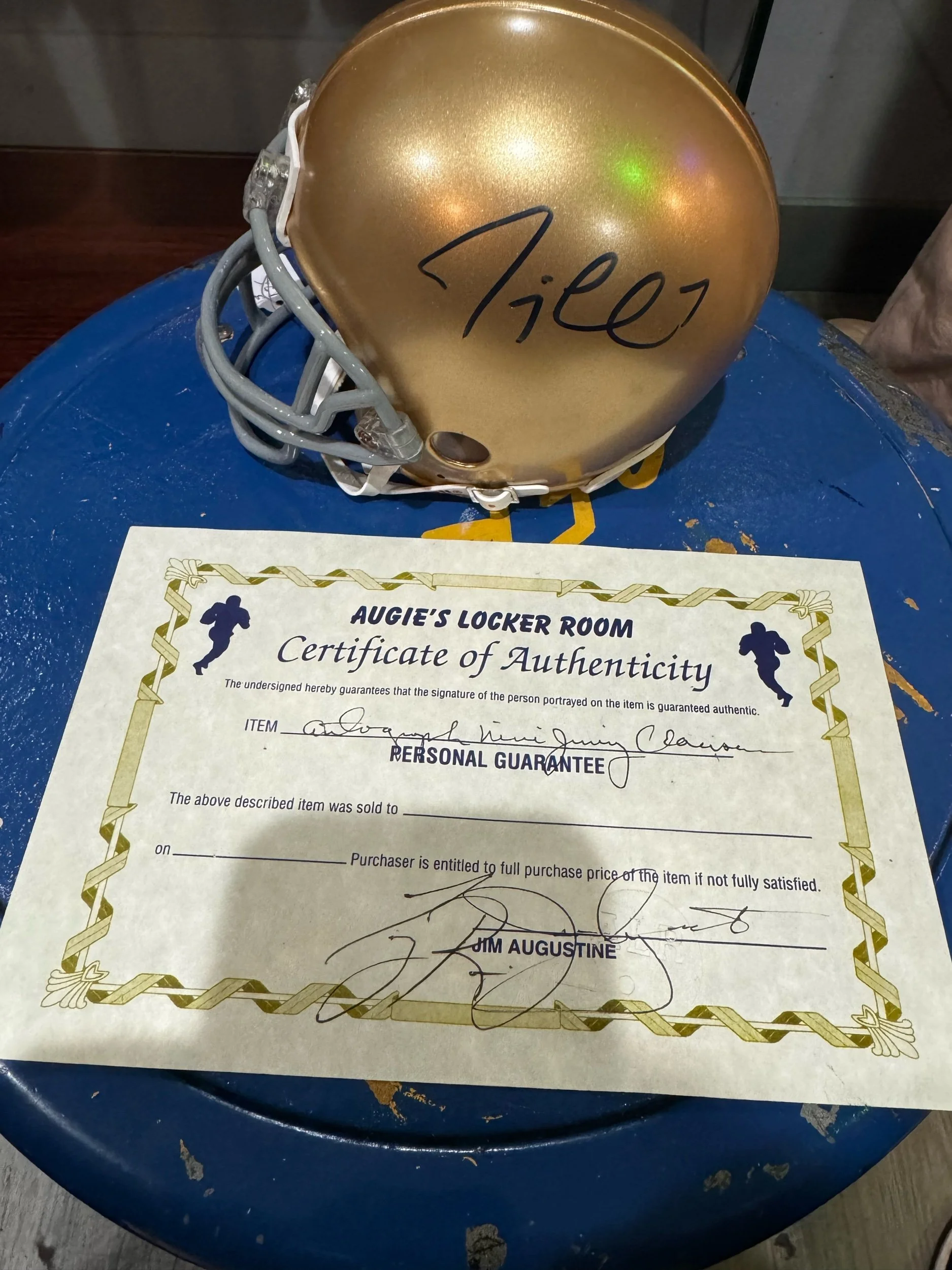 Notre Dame football mini helmet signed Jimmy Clausen $120.00 Notre Dame football mini helmet signed Jimmy Clausen Online Store › Notre Dame football mini helmet signed Jimmy Clausen Purchase Added! Notre Dame football mini helmet signed Jimmy Clausen