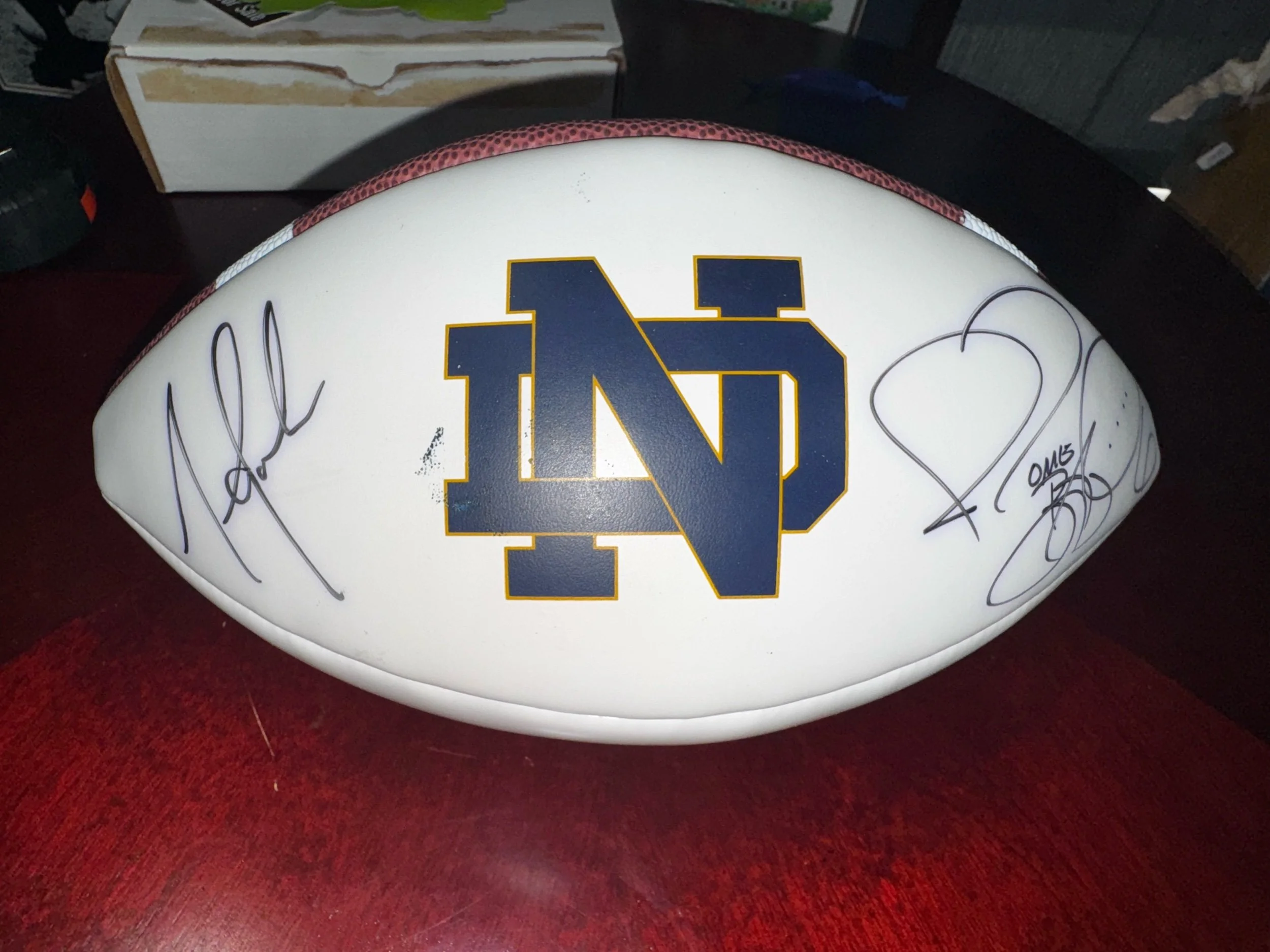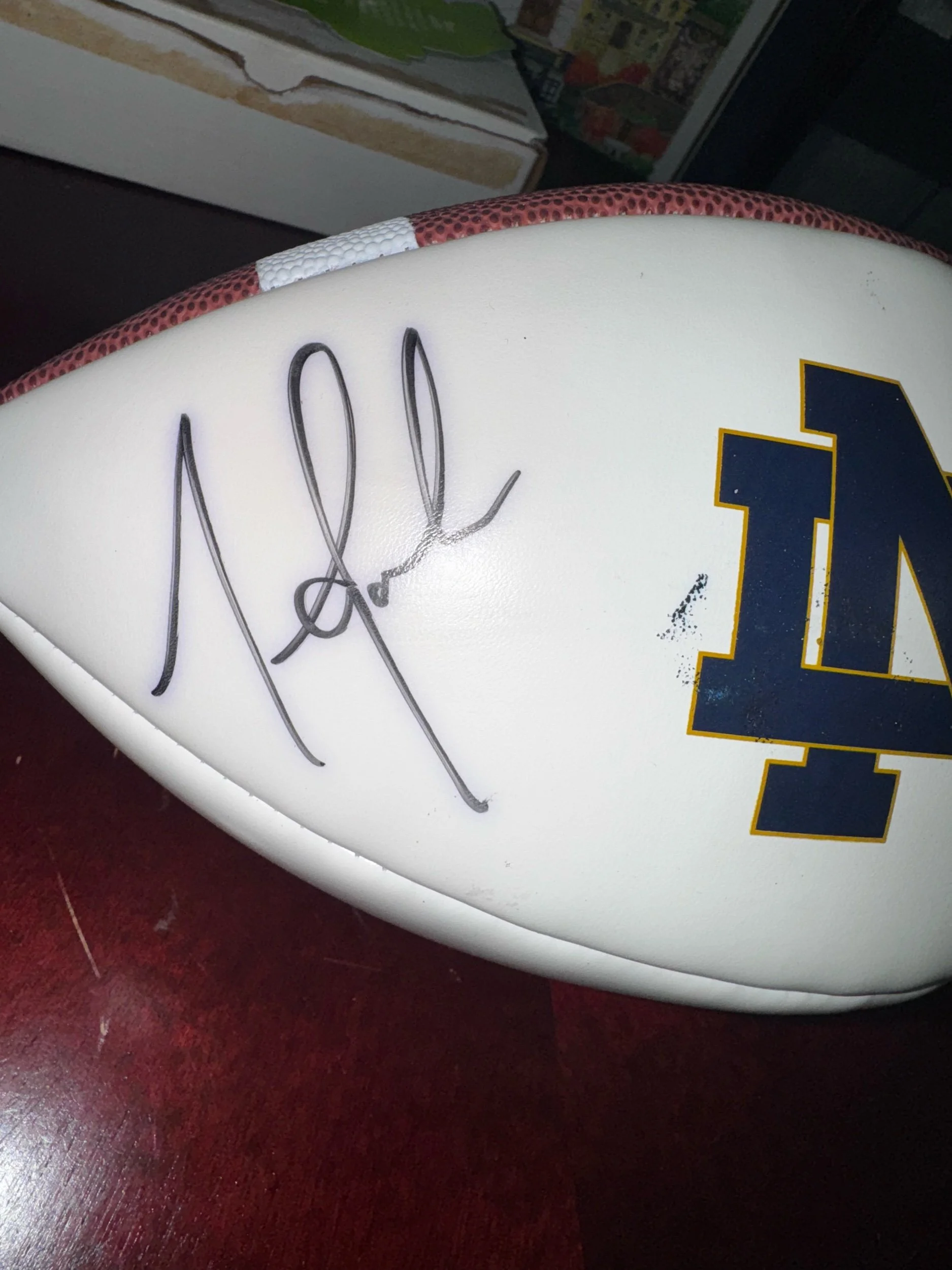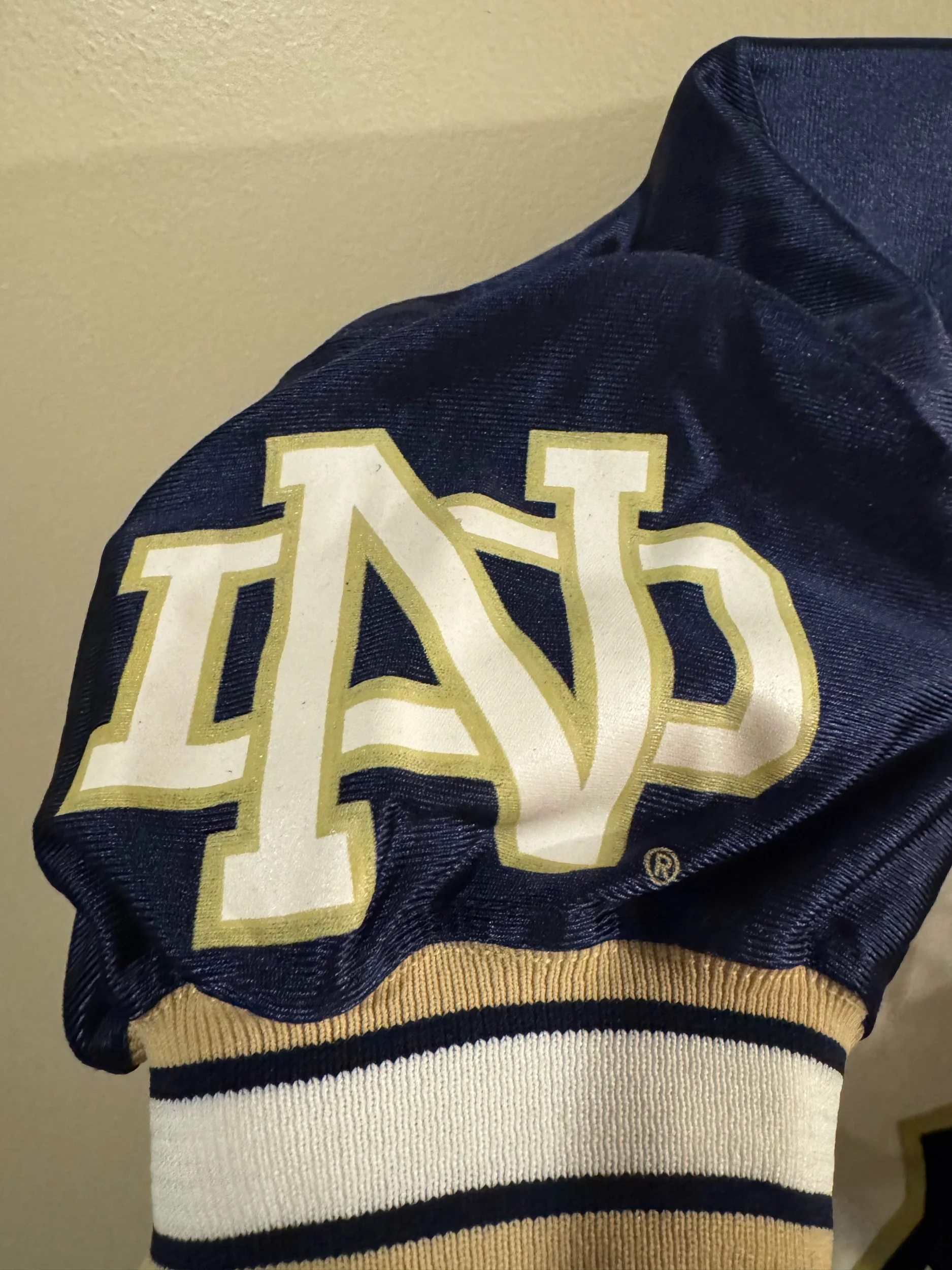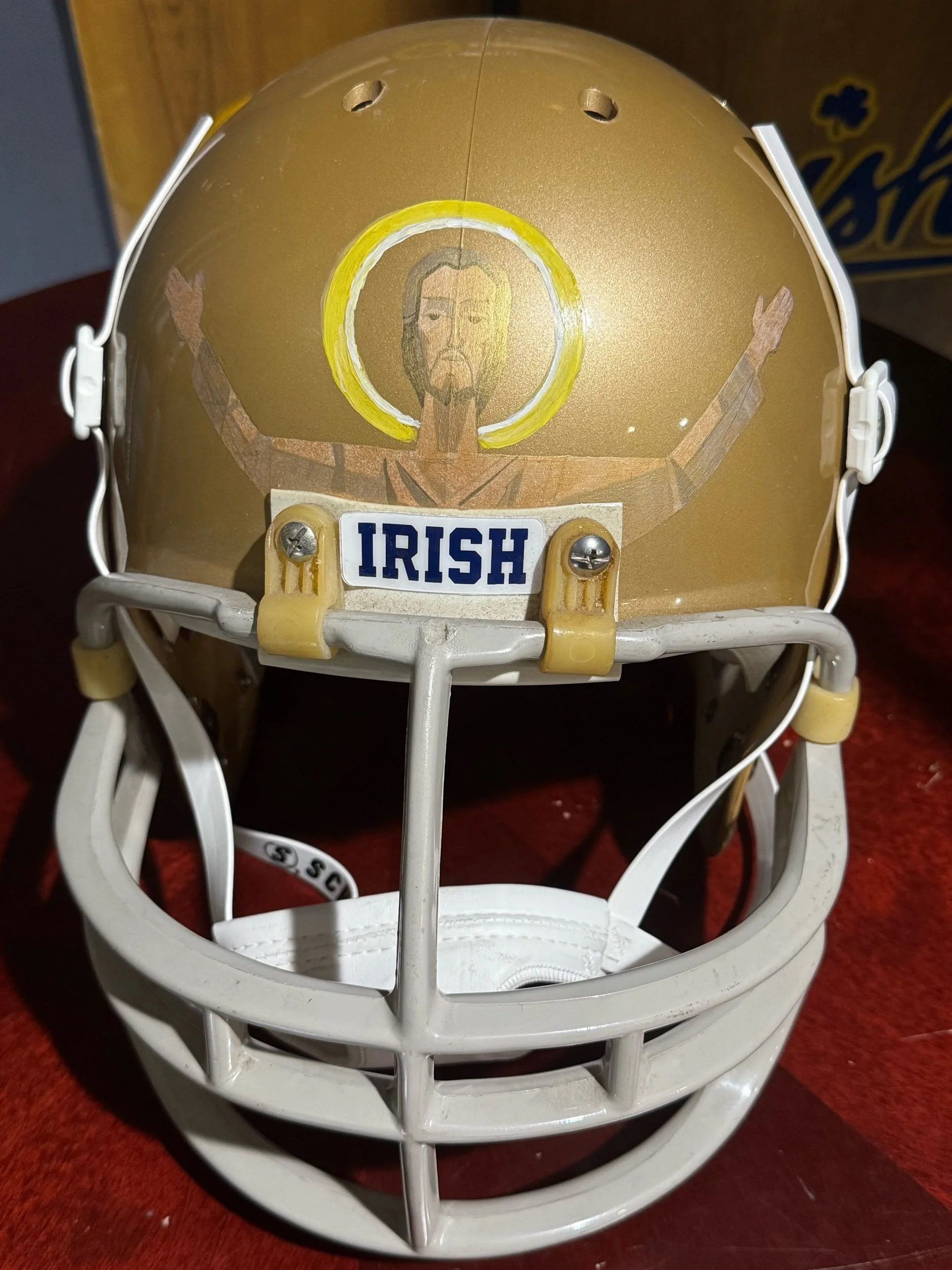 Each Notre Dame football helmet shines with a golden luster, reflecting a legacy of excellence and the unwavering spirit of the Fighting Irish. Categories: All Signed Notre Dame Full Sized Helmets Famous Notre Dame Artists Clothing Legends of The Game Featured Footballs Helmets Online Store All | Signed Notre Dame Full Sized Helmets | Famous Notre Dame Artists | Clothing | Legends of The Game | Featured | Footballs | Helmets | LIMITED EDITION "NOTRE DAME" TEDDY BEAR BY COOPERSTOWN BEARS OFFICIALLY LICENSED $285.00 Full size 1988 National Championship Notre Dame football $90.00 Sold Out Full Size Replica Notre Dame ball helmet painted $135.00 VERY RARE: Antique Flesh-Colored Knute Rockne Bust $2,500.00 Bryant Young San Francisco 49ers Team Issued Football Jersey Signed Sale Price: $685.00 Original Price: $785.00 Sale NOTRE DAME HEAD COACH KNUTE ROCKNE LARGE BUST JERRY MCKENNA $12,500.00 Notre Dame Football Movie Rudy Script signed by Rudy Ruettiger $385.00 RARE 1966 NOTRE DAME FOOTBALL VS MICHIGAN STATE FOOTBALL TICKET/PROGRAM $875.00 RARE 2012 Notre Dame Football Wilson Football Dublin Ireland $1,500.00 Rare Framed Notre Dame Four Horsemen Signatures Crowley, Layden, Miller, Stuhldreher. Grantland Rice $5,750.00 Full Size Notre Dame Football signed Bettis, Golic, and Rocket $185.00 1976 Full Size Notre Dame football Signed Joe Montana $185.00 Sold Out Seven Notre Dame Heisman trophy winners ballots $1,250.00 2019 TEAM ISSUED NOTRE DAME FOOTBALL UNDER ARMOUR GAME PANTS 150 YR GAME #71 $50.00 Use team issued Notre Dame baseball cleats, and new gloves $55.00 Used team issue, Notre Dame baseball Bryce Harper under Armour cleats, and New gloves $55.00 Used team issued Notre Dame football cleats and new gloves $35.00 Sold Out 2017 Game Used Notre Dame Football Game Pants #97 $50.00 Team Issued Notre Dame Football Home Jersey #16 $450.00 Team Issued Notre Dame Football Home Jersey #80 $475.00 2010 Team Issued Notre Dame Football Home Jersey $300.00 Used team issued Notre Dame football gloves $25.00 Sold Out Used team issued Notre Dame football gloves and cleats $40.00 Sold Out Notre Dame Football Jeremiyah Love signed photo 8x10 $85.00 Sold Out Limited Notre Dame football cooperstown Bear. $300.00 2010 HARRISON SMITH GAME USED NOTRE DAME FOOTBALL ADIDAS JERSEY HOME STEINER $1,850.00 2009 GAME USED NOTRE DAME FOOTBALL HOME JERSEY STEINER COA JIMMY CLAUSEN $1,500.00 2002 Notre Dame football banner used at the bowl game displayed at the ND ALUMNI ASSOCIATION $170.00 The FOUR WINNERS by KNUTE ROCKNE the story of a great football team signed Jack Rockne $350.00 ALL RISE THE REMARKABLE JOURNEY OF ALAN PAGE BY BILL MCGRANE SIGNED ALAN PAGE $250.00 GOD, COUNTRY, NOTRE DAME THE AUTOBIOGRAPHY OF THEODORE M. HESBURGH WITH JERRY REEDY $225.00 Sold Out Notre Dame Where have you gone? Signed Author Eric Hansen & Robin Weber $125.00 Simply Devine Memoirs of a Hall Of Fame coach Book Signed Dan Devine $175.00 Sold Out TRAVELS WITH TED & NED THEODORE M. HESBURGH EDITED BY JERRY REEDY SIGNED $125.00 University of Notre Dame Aerial Photo matted Cartier Field $195.00 1996 Tracy Stouffer University of Notre Dame Framed picture $185.00 Rare 2012 Team issued Notre Dame Football Shamrock Series Helmet $10,500.00 Wild Sports 5501-ND NCAA Notre Dame Fighting Irish Leather Office Chair $585.00 Circa 1990s Notre Dame Football Jersey #40 $325.00 Circa Early 2000s Notre Dame Football Jersey #1 $325.00 Circa 1990s Notre Dame Football Jersey #5 $325.00 Replica Signed Michael Mayer Jersey Inscribed Beckett $165.00 Replica Signed Lou Holtz Jersey Inscribed JSA $185.00 Sold Out Replica Signed Rudy Ruettiger Jersey Inscribed JSA $165.00 Sold Out Replica Signed Rudy Ruettiger jersey Inscribed Beckett COA $165.00 Sold Out Authentic Notre Dame Football Locker $4,500.00 Sold Out Authentic 1923 Notre Dame Football vs Purdue Football Ticket stub $2,750.00 Authentic 1930 Notre Dame Football vs University of Southern California Football Ticket stub $1,500.00 1927 Notre Dame Football vs USC Football Ticket Authentic $1,350.00 Notre Dame Football Coach Knute Rockne Original Photo & Signature $3,850.00 Sold Out Novel by Knute Rockne: "The Four Winners: The Head, The Hands, The Foot, The Ball." Hardcover, First Edition, signed Knute Rockne $4,650.00 Notre Dame Football Replica Jersey Signed Kyle Rudolph COA $145.00 Notre Dame Football Replica Jersey Signed Kris Haines $155.00 Notre Dame Football Replica Jersey Signed Wes Pritchett COA $125.00 Notre Dame Football Replica Jersey Signed Kyren Williams COA $185.00 Notre Dame Football Coach Knute Rockne Framed Photo copy Cover Time Magazine $25.50 Sold Out 1973 Notre Dame Football National Championship Framed Poster $85.00 Original Notre Dame Football Coach Rockne Photo PSA W/ dated magazine in photo $2,350.00 Rare Original Jim Wainwright Notre Dame Painting Signed $3,500.00 Authentic Notre Dame Football Stadium Brick $265.00 Rare Notre Dame and St Mary’s Music Sheet $185.00 Unique Notre Dame John Holladay Poster $150.00 Sold Out Notre Dame Baseball Full Size Helmet Signed by Jeff Samardzija $1,200.00 Rare Jeff Samardzija football/baseball Bobblehead $225.00 Notre Dame Football Mini Helmet Signed Benjamin Morrison COA $165.00 2017 Replica Notre Dame Football Rockne Heritage Game helmet Full Size $245.00 Sold Out NOTRE DAME FOOTBALL MINI HELMET SIGNED Drayk Bowen COA $165.00 Replica Notre Dame Football Joe Montana Signed Jersey COA $385.00 Sold Out Notre Dame football replica jersey signed Tim Brown COA $250.00 Sold Out Original Notre Dame football 1927 team photo Knute Rockne Head Coach $2,850.00 Original Notre Dame football 1926 team photo Knute Rockne Head Coach $1,950.00 University of Notre Dame the Spirit of Notre Dame Oak room miniatures usher $225.00 Sold Out Notre Dame football coach LOU HOLTZ STATUE with box $350.00 Notre Dame football coach Ara Parseghian bobble head with box $450.00 Notre Dame football mini helmet signed Ryan Grant $125.00 Notre Dame Stadium Commemorative coin First g