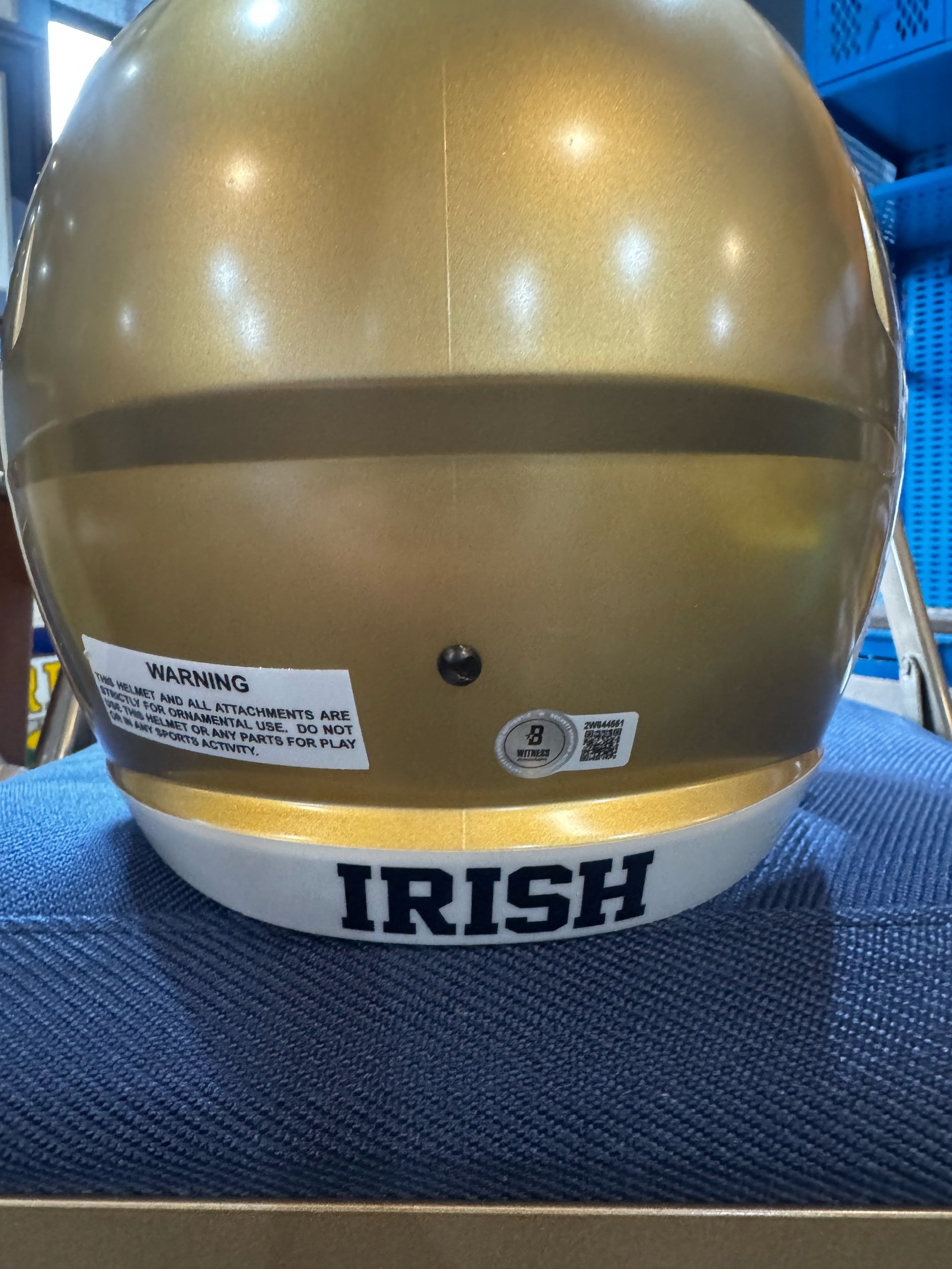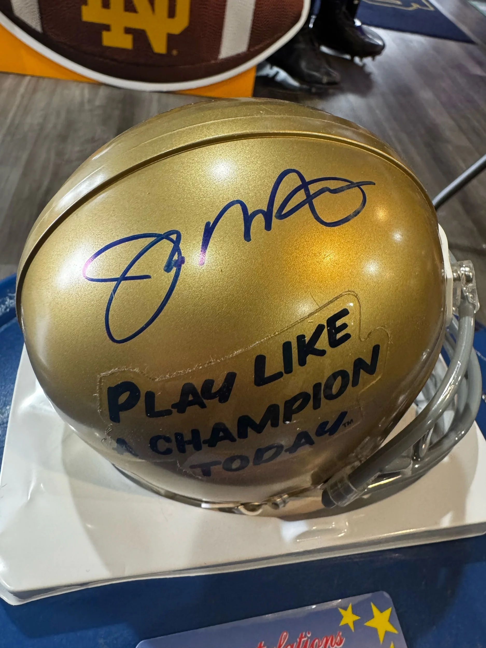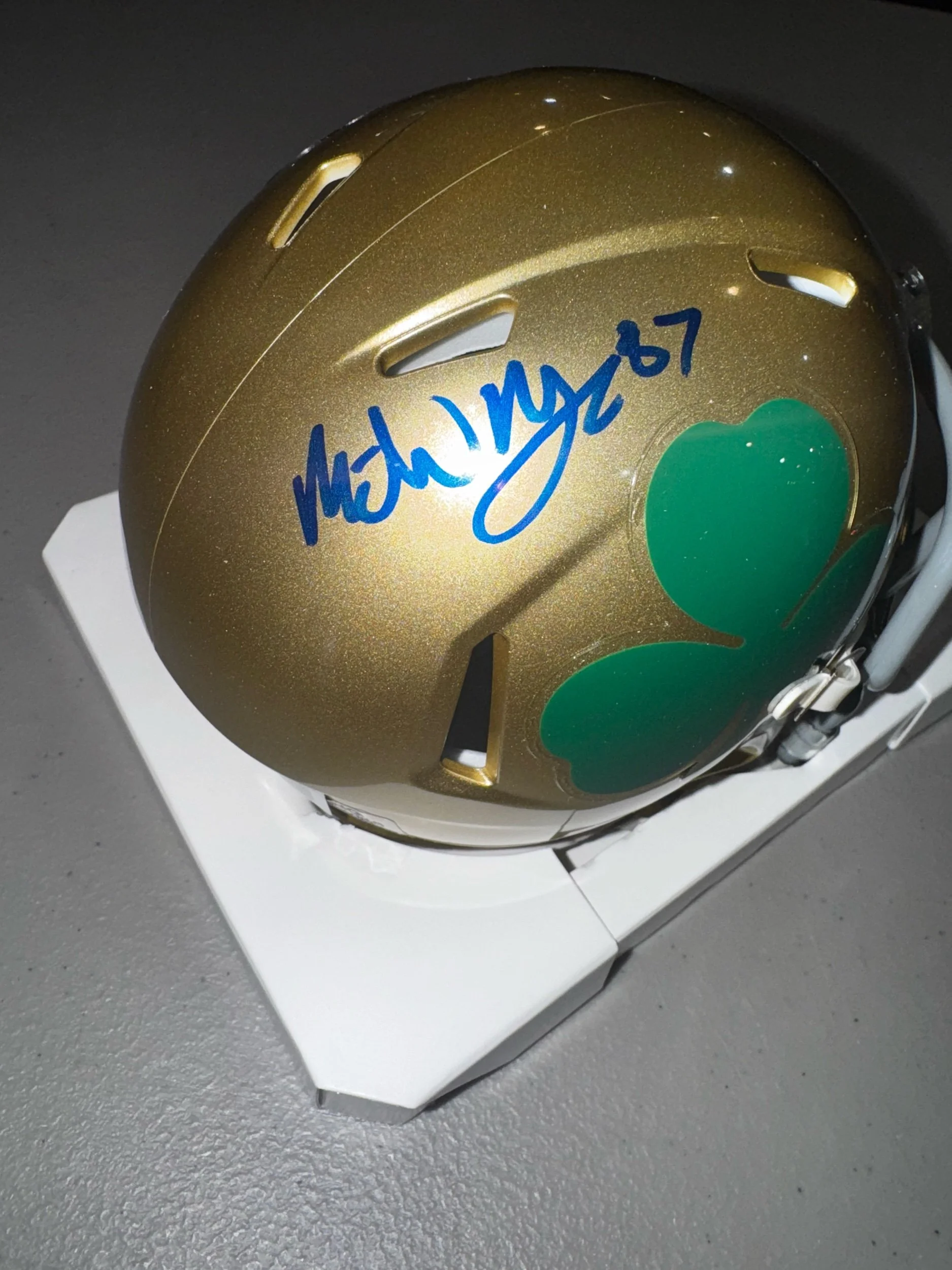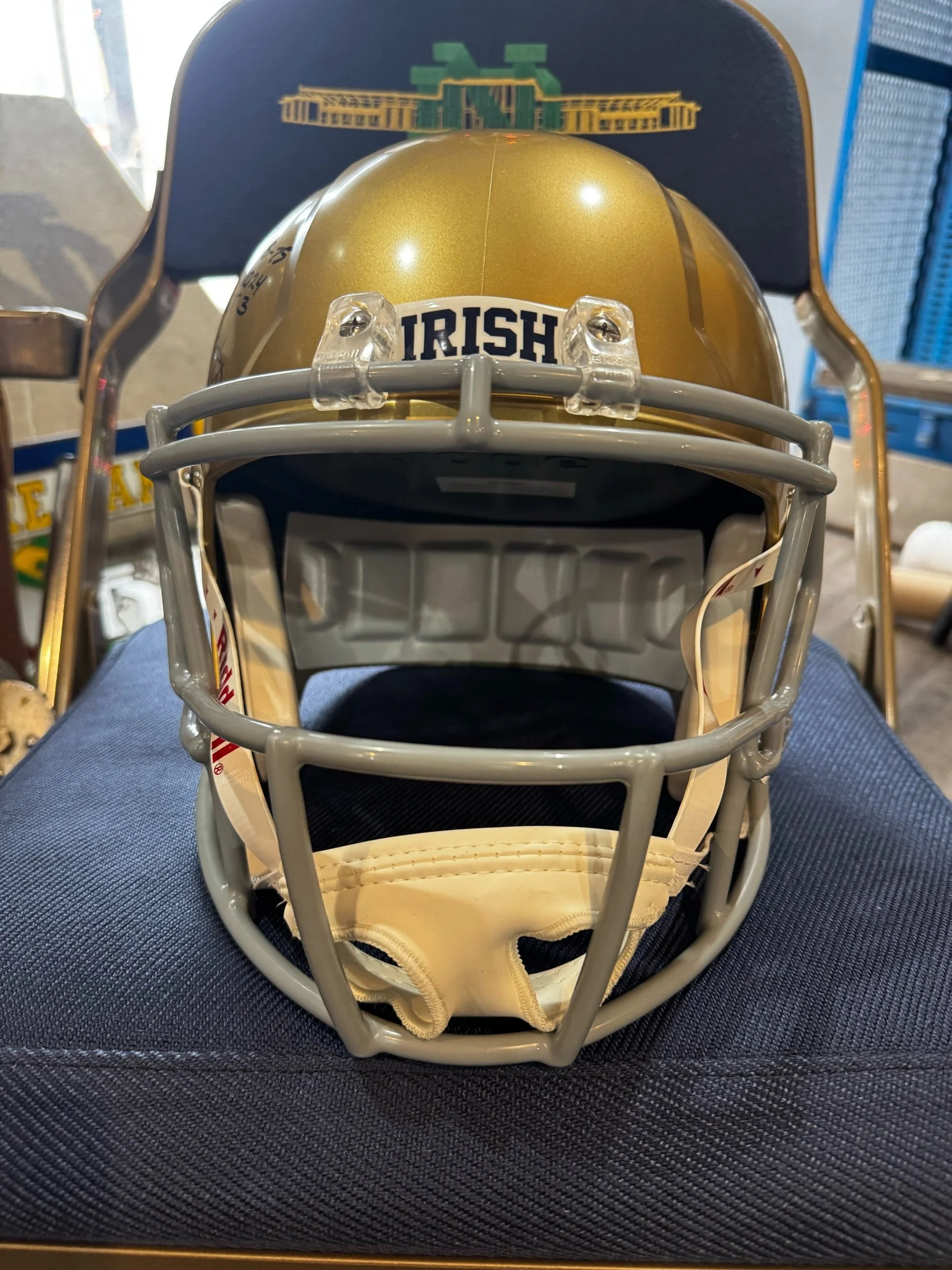 Each Notre Dame football helmet shines with a golden luster, reflecting a legacy of excellence and the unwavering spirit of the Fighting Irish. Online Store Categories: All Signed Notre Dame Full Sized Helmets Famous Notre Dame Artists Clothing Legends of The Game Featured Footballs Helmets Online Store All | Signed Notre Dame Full Sized Helmets | Famous Notre Dame Artists | Clothing | Legends of The Game | Featured | Footballs | Helmets | Notre Dame football Mini Helmet signed Marcus Freeman w COA $225.00 Full Size Replica Notre Dame football helmet signed Rudy Ruettiger inscribed w COA $350.00 Marcus Freeman Signed 11x17 inch Photo coa $185.00 Game Used Notre Dame Football Signed Lou Holtz $485.00 Notre Dame Play Like A Champion Today metal sign Signed Laurie Wenger $30.00 Notre Dame Football Mini Helmet Signed Joe Montana COA $350.00 Notre Dame football Mini helmet signed Jerome Bettis COA $350.00 Notre Dame Football Mini Helmet Signed Tim Brown COA $265.00 Limited /40 Notre Dame Football Mini Helmet Signed Reggie Brooks COA $185.00 Notre Dame Football Mini Helmet Signed Michael Mayer COA $145.00 Notre Dame Football Mini Helmet Signed Jack Kiser COA $135.00 Sold Out Notre Dame Football Mini Helmet Signed Rocket Ismail COA $185.00 Notre Dame Football Mini Helmet Signed Kyle Hamilton COA $165.00 Sold Out Notre Dame Play Like A Champion Today Mini helmet Signed Laurie Wenger $45.00 Notre Dame Play Like A Champion Today Poster Signed Laurie Wenger $30.00 Notre Dame football mini helmet signed JD Bertrand $115.00 Notre Dame football mini helmet signed Stephon Tuitt JSA COA $85.00 Notre Dame football mini helmet signed Brian Kelly Beckett COA $125.00 Notre Dame football mini helmet signed Julius Jones JSA COA $125.00 Notre Dame football mini helmet signed Equanimeous St. Brown $95.00 Notre Dame football mini helmet signed Jaylen Sneed $125.00 Notre Dame football mini helmet signed Kyle Rudolph $115.00 Notre Dame football mini helmet signed Jimmy Clausen $120.00 Notre Dame football mini helmet signed Gabriel Rubio $85.00 Notre Dame football mini helmet signed Michael Floyd $125.00 VERY RARE: Antique Flesh-Colored Knute Rockne Bust $2,500.00 Bryant Young San Francisco 49ers Team Issued Football Jersey Signed Sale Price: $685.00 Original Price: $785.00 Sale NOTRE DAME HEAD COACH KNUTE ROCKNE LARGE BUST JERRY MCKENNA $12,500.00 Notre Dame Football Movie Rudy Script signed by Rudy Ruettiger $385.00 RARE 1966 NOTRE DAME FOOTBALL VS MICHIGAN STATE FOOTBALL TICKET/PROGRAM $875.00 RARE 2012 Notre Dame Football Wilson Football Dublin Ireland $1,500.00 Rare Framed Notre Dame Four Horsemen Signatures Crowley, Layden, Miller, Stuhldreher. Grantland Rice $5,750.00 Seven Notre Dame Heisman trophy winners ballots $1,250.00 Use team issued Notre Dame baseball cleats, and new gloves $55.00 Used team issue, Notre Dame baseball Bryce Harper under Armour cleats, and New gloves $55.00 Team Issued Notre Dame Football Home Jersey #16 $450.00 Team Issued Notre Dame Football Home Jersey #80 $475.00 2010 Team Issued Notre Dame Football Home Jersey $300.00 Limited Notre Dame football cooperstown Bear. Sale Price: $285.00 Original Price: $300.00 Sale 2010 HARRISON SMITH GAME USED NOTRE DAME FOOTBALL ADIDAS JERSEY HOME STEINER $1,850.00 2009 GAME USED NOTRE DAME FOOTBALL HOME JERSEY STEINER COA JIMMY CLAUSEN $1,500.00 2002 Notre Dame football banner used at the bowl game displayed at the ND ALUMNI ASSOCIATION $170.00 The FOUR WINNERS by KNUTE ROCKNE the story of a great football team signed Jack Rockne $350.00 ALL RISE THE REMARKABLE JOURNEY OF ALAN PAGE BY BILL MCGRANE SIGNED ALAN PAGE $250.00 GOD, COUNTRY, NOTRE DAME THE AUTOBIOGRAPHY OF THEODORE M. HESBURGH WITH JERRY REEDY $225.00 Sold Out Notre Dame Where have you gone? Signed Author Eric Hansen & Robin Weber $125.00 Sold Out TRAVELS WITH TED & NED THEODORE M. HESBURGH EDITED BY JERRY REEDY SIGNED $125.00 University of Notre Dame Aerial Photo matted Cartier Field $195.00 1996 Tracy Stouffer University of Notre Dame Framed picture $185.00 Rare 2012 Team issued Notre Dame Football Shamrock Series Helmet $10,500.00 Wild Sports 5501-ND NCAA Notre Dame Fighting Irish Leather Office Chair $585.00 Sold Out Circa 1990s Notre Dame Football Jersey #40 $325.00 Circa Early 2000s Notre Dame Football Jersey #1 $325.00 Circa 1990s Notre Dame Football Jersey #5 $325.00 Authentic 1923 Notre Dame Football vs Purdue Football Ticket stub $2,750.00 Authentic 1930 Notre Dame Football vs University of Southern California Football Ticket stub $1,500.00 1927 Notre Dame Football vs USC Football Ticket Authentic $1,350.00 Notre Dame Football Replica Jersey Signed Kyle Rudolph COA $145.00 Notre Dame Football Replica Jersey Signed Kory Minor Sale Price: $125.00 Original Price: $155.00 Sale Notre Dame Football Replica Jersey Signed Wes Pritchett COA $125.00 Rare Original Jim Wainwright Notre Dame Painting Signed $3,500.00 Authentic Notre Dame Football Stadium Brick $265.00 Rare Notre Dame and St Mary’s Music Sheet Sale Price: $165.00 Original Price: $185.00 Sale Notre Dame Baseball Full Size Helmet Signed by Jeff Samardzija $1,200.00 Rare Jeff Samardzija football/baseball Bobblehead Sale Price: $185.00 Original Price: $225.00 Sale NOTRE DAME FOOTBALL MINI HELMET SIGNED Drayk Bowen COA $165.00 Original Notre Dame football 1927 team photo Knute Rockne Head Coach $2,850.00 Original Notre Dame football 1926 team photo Knute Rockne Head Coach Sale Price: $1,850.00 Original Price: $1,950.00 Sale Notre Dame football coach LOU HOLTZ STATUE with box $350.00 Notre Dame football coach Ara Parseghian bobble head with box $450.00 Sold Out Notre Dame football mini helmet signed Ryan Grant $125.00 Notre Dame Stadium Commemorative coin First game Georgia Tech 1997 $85.00 Vintage Notre Dame Tie Clasp 1950s or 60s $125.00 Vintage Notre Dame Tie Clasp 1950s $125.00 Notre Dame Football Full Size Four Horsemen logo $110.00 NOTRE DAME SOUTH BEND by SOUTH SHORE LINE Copy Poster $125.00 Notre Dame football Varsity C