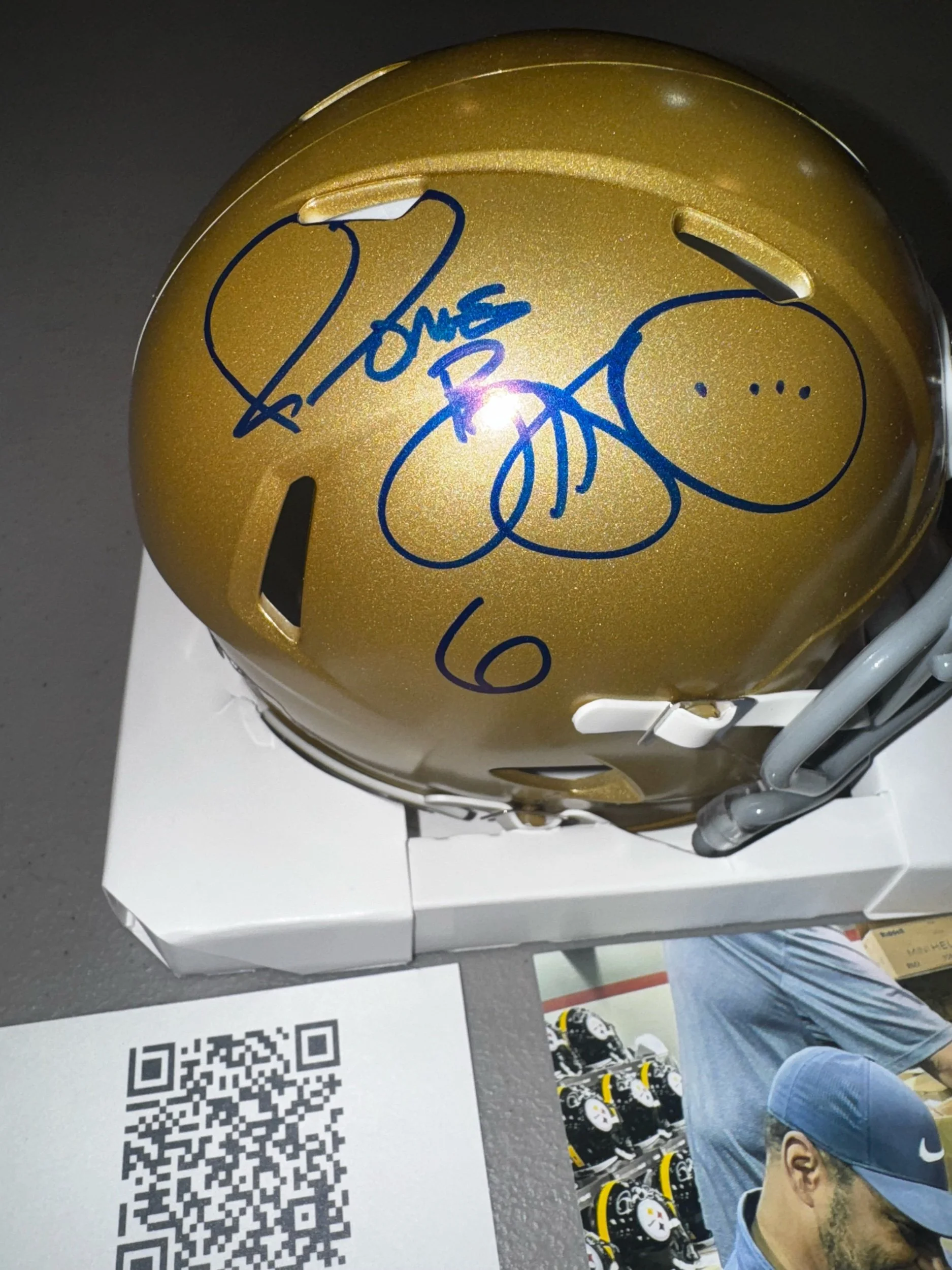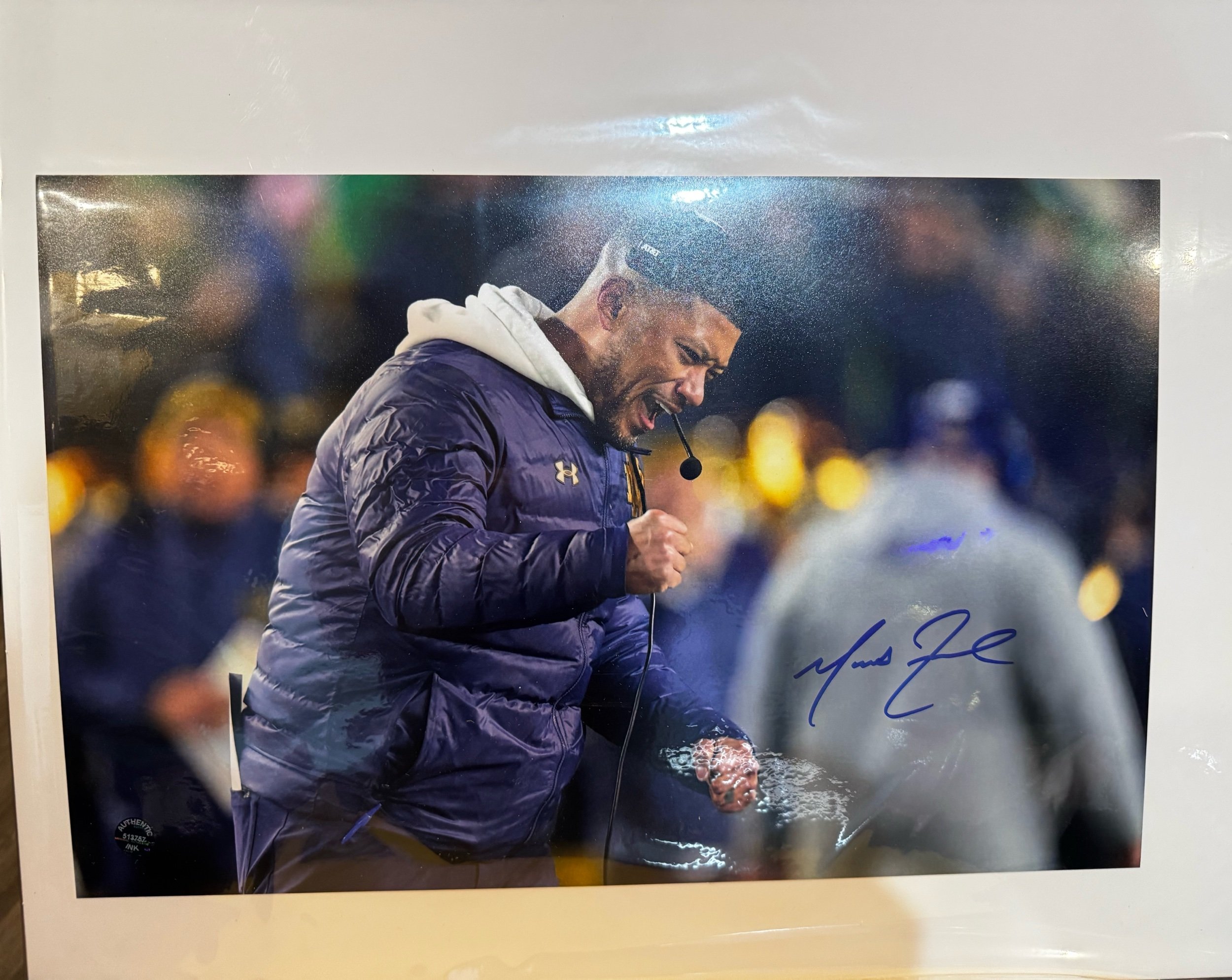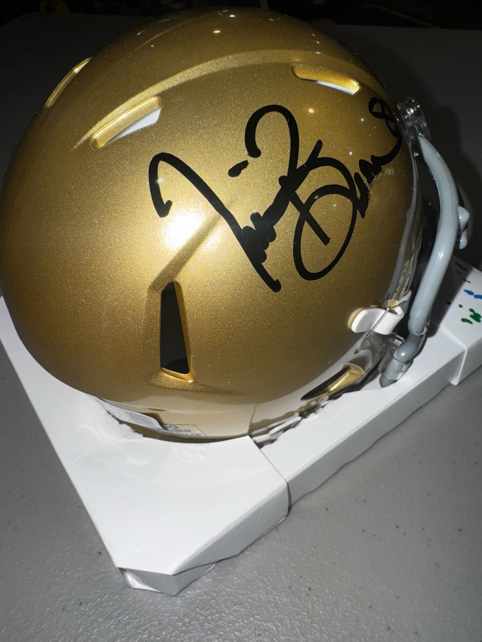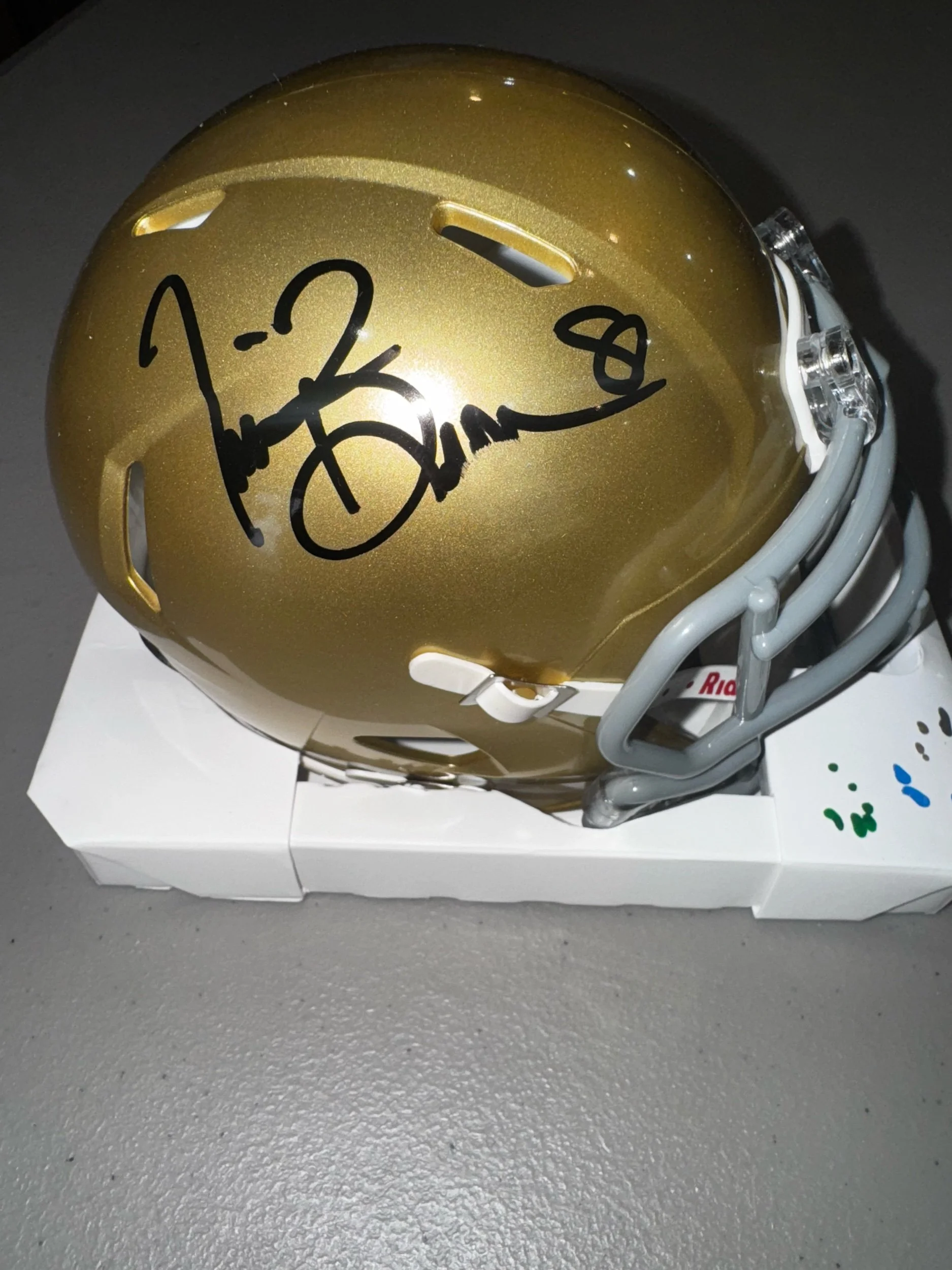 Each Notre Dame football helmet shines with a golden luster, reflecting a legacy of excellence and the unwavering spirit of the Fighting Irish. Online Store Categories: All Signed Notre Dame Full Sized Helmets Famous Notre Dame Artists Clothing Legends of The Game Featured Footballs Helmets Online Store All | Signed Notre Dame Full Sized Helmets | Famous Notre Dame Artists | Clothing | Legends of The Game | Featured | Footballs | Helmets | Notre Dame football Mini Helmet signed Marcus Freeman w COA $225.00 Full Size Replica Notre Dame football helmet signed Rudy Ruettiger inscribed w COA $350.00 Marcus Freeman Signed 11x17 inch Photo coa $185.00 Game Used Notre Dame Football Signed Lou Holtz $485.00 Notre Dame Play Like A Champion Today metal sign Signed Laurie Wenger $30.00 Notre Dame Football Mini Helmet Signed Joe Montana COA $350.00 Notre Dame football Mini helmet signed Jerome Bettis COA $350.00 Notre Dame Football Mini Helmet Signed Tim Brown COA $265.00 Limited /40 Notre Dame Football Mini Helmet Signed Reggie Brooks COA $185.00 Notre Dame Football Mini Helmet Signed Michael Mayer COA $145.00 Notre Dame Football Mini Helmet Signed Jack Kiser COA $135.00 Sold Out Notre Dame Football Mini Helmet Signed Rocket Ismail COA $185.00 Notre Dame Football Mini Helmet Signed Kyle Hamilton COA $165.00 Sold Out Notre Dame Play Like A Champion Today Mini helmet Signed Laurie Wenger $45.00 Notre Dame Play Like A Champion Today Poster Signed Laurie Wenger $30.00 Notre Dame football mini helmet signed JD Bertrand $115.00 Notre Dame football mini helmet signed Stephon Tuitt JSA COA $85.00 Notre Dame football mini helmet signed Brian Kelly Beckett COA $125.00 Notre Dame football mini helmet signed Julius Jones JSA COA $125.00 Notre Dame football mini helmet signed Equanimeous St. Brown $95.00 Notre Dame football mini helmet signed Jaylen Sneed $125.00 Notre Dame football mini helmet signed Kyle Rudolph $115.00 Notre Dame football mini helmet signed Jimmy Clausen $120.00 Notre Dame football mini helmet signed Gabriel Rubio $85.00 Notre Dame football mini helmet signed Michael Floyd $125.00 VERY RARE: Antique Flesh-Colored Knute Rockne Bust $2,500.00 Bryant Young San Francisco 49ers Team Issued Football Jersey Signed Sale Price: $685.00 Original Price: $785.00 Sale NOTRE DAME HEAD COACH KNUTE ROCKNE LARGE BUST JERRY MCKENNA $12,500.00 Notre Dame Football Movie Rudy Script signed by Rudy Ruettiger $385.00 RARE 1966 NOTRE DAME FOOTBALL VS MICHIGAN STATE FOOTBALL TICKET/PROGRAM $875.00 RARE 2012 Notre Dame Football Wilson Football Dublin Ireland $1,500.00 Rare Framed Notre Dame Four Horsemen Signatures Crowley, Layden, Miller, Stuhldreher. Grantland Rice $5,750.00 Seven Notre Dame Heisman trophy winners ballots $1,250.00 Use team issued Notre Dame baseball cleats, and new gloves $55.00 Used team issue, Notre Dame baseball Bryce Harper under Armour cleats, and New gloves $55.00 Team Issued Notre Dame Football Home Jersey #16 $450.00 Team Issued Notre Dame Football Home Jersey #80 $475.00 2010 Team Issued Notre Dame Football Home Jersey $300.00 Limited Notre Dame football cooperstown Bear. Sale Price: $285.00 Original Price: $300.00 Sale 2010 HARRISON SMITH GAME USED NOTRE DAME FOOTBALL ADIDAS JERSEY HOME STEINER $1,850.00 2009 GAME USED NOTRE DAME FOOTBALL HOME JERSEY STEINER COA JIMMY CLAUSEN $1,500.00 2002 Notre Dame football banner used at the bowl game displayed at the ND ALUMNI ASSOCIATION $170.00 The FOUR WINNERS by KNUTE ROCKNE the story of a great football team signed Jack Rockne $350.00 ALL RISE THE REMARKABLE JOURNEY OF ALAN PAGE BY BILL MCGRANE SIGNED ALAN PAGE $250.00 GOD, COUNTRY, NOTRE DAME THE AUTOBIOGRAPHY OF THEODORE M. HESBURGH WITH JERRY REEDY $225.00 Sold Out Notre Dame Where have you gone? Signed Author Eric Hansen & Robin Weber $125.00 Sold Out TRAVELS WITH TED & NED THEODORE M. HESBURGH EDITED BY JERRY REEDY SIGNED $125.00 University of Notre Dame Aerial Photo matted Cartier Field $195.00 1996 Tracy Stouffer University of Notre Dame Framed picture $185.00 Rare 2012 Team issued Notre Dame Football Shamrock Series Helmet $10,500.00 Wild Sports 5501-ND NCAA Notre Dame Fighting Irish Leather Office Chair $585.00 Sold Out Circa 1990s Notre Dame Football Jersey #40 $325.00 Circa Early 2000s Notre Dame Football Jersey #1 $325.00 Circa 1990s Notre Dame Football Jersey #5 $325.00 Authentic 1923 Notre Dame Football vs Purdue Football Ticket stub $2,750.00 Authentic 1930 Notre Dame Football vs University of Southern California Football Ticket stub $1,500.00 1927 Notre Dame Football vs USC Football Ticket Authentic $1,350.00 Notre Dame Football Replica Jersey Signed Kyle Rudolph COA $145.00 Notre Dame Football Replica Jersey Signed Kory Minor Sale Price: $125.00 Original Price: $155.00 Sale Notre Dame Football Replica Jersey Signed Wes Pritchett COA $125.00 Rare Original Jim Wainwright Notre Dame Painting Signed $3,500.00 Authentic Notre Dame Football Stadium Brick $265.00 Rare Notre Dame and St Mary’s Music Sheet Sale Price: $165.00 Original Price: $185.00 Sale Notre Dame Baseball Full Size Helmet Signed by Jeff Samardzija $1,200.00 Rare Jeff Samardzija football/baseball Bobblehead Sale Price: $185.00 Original Price: $225.00 Sale NOTRE DAME FOOTBALL MINI HELMET SIGNED Drayk Bowen COA $165.00 Original Notre Dame football 1927 team photo Knute Rockne Head Coach $2,850.00 Original Notre Dame football 1926 team photo Knute Rockne Head Coach Sale Price: $1,850.00 Original Price: $1,950.00 Sale Notre Dame football coach LOU HOLTZ STATUE with box $350.00 Notre Dame football coach Ara Parseghian bobble head with box $450.00 Sold Out Notre Dame football mini helmet signed Ryan Grant $125.00 Notre Dame Stadium Commemorative coin First game Georgia Tech 1997 $85.00 Vintage Notre Dame Tie Clasp 1950s or 60s $125.00 Vintage Notre Dame Tie Clasp 1950s $125.00 Notre Dame Football Full Size Four Horsemen logo $110.00 NOTRE DAME SOUTH BEND by SOUTH SHORE LINE Copy Poster $125.00 Notre Dame football Varsity C