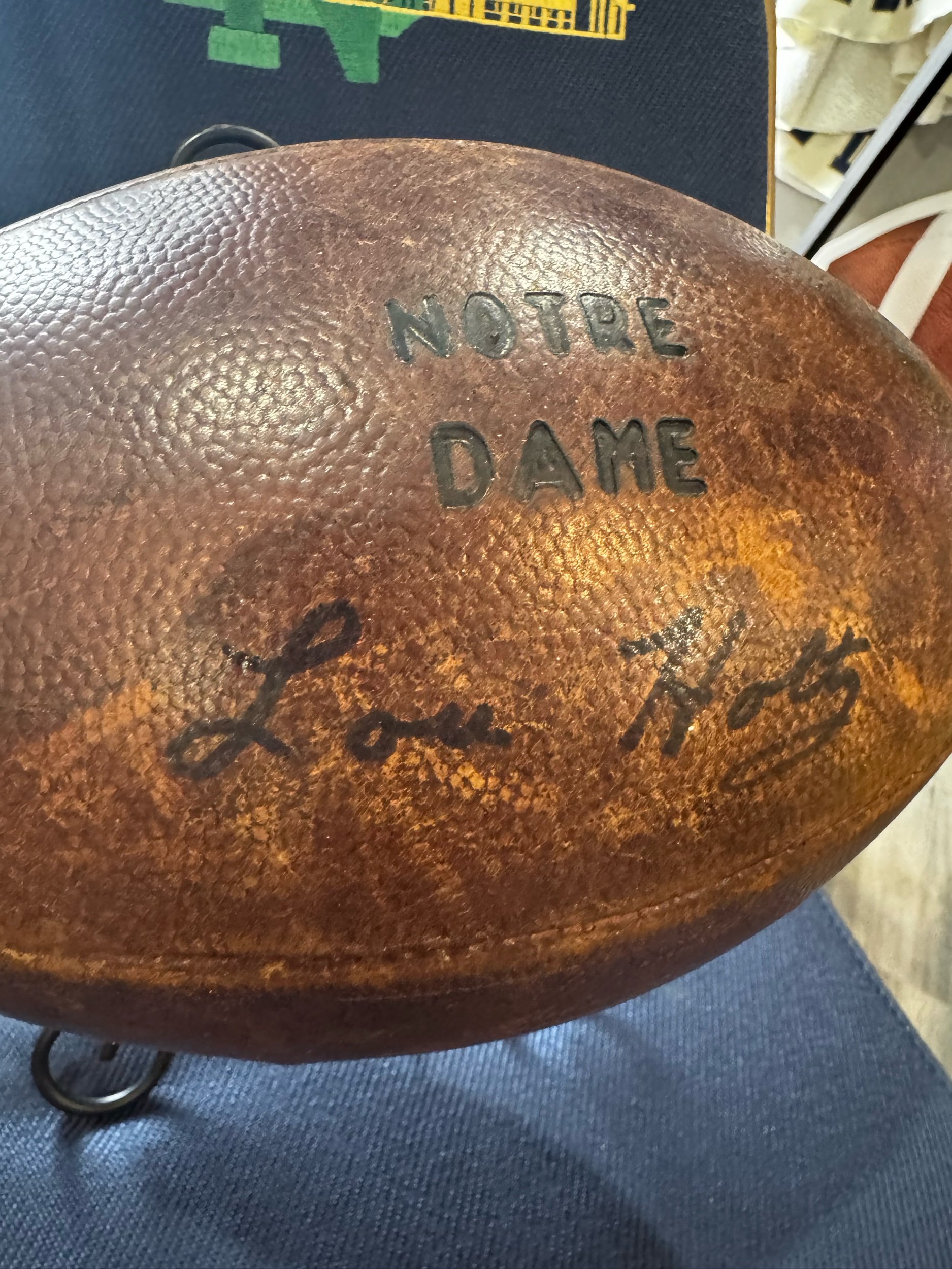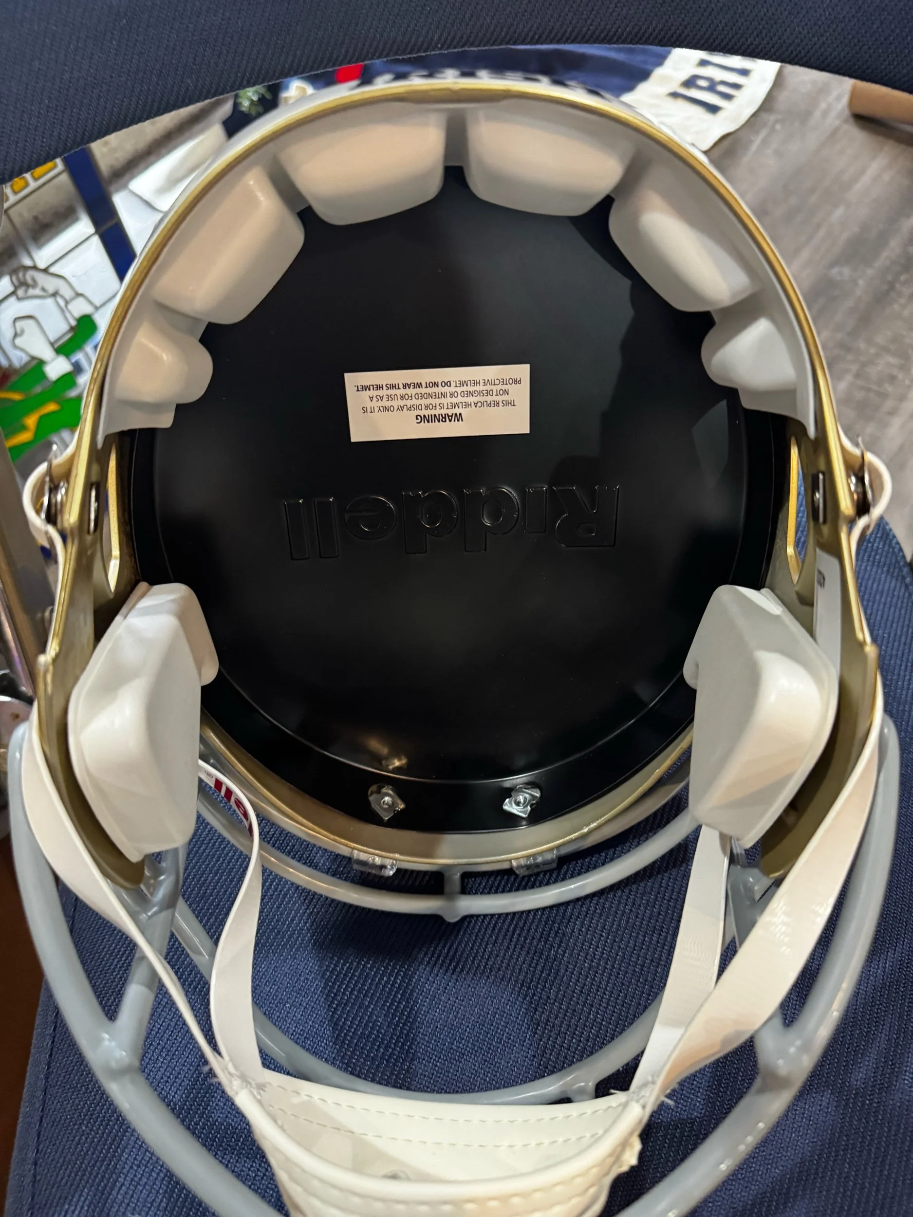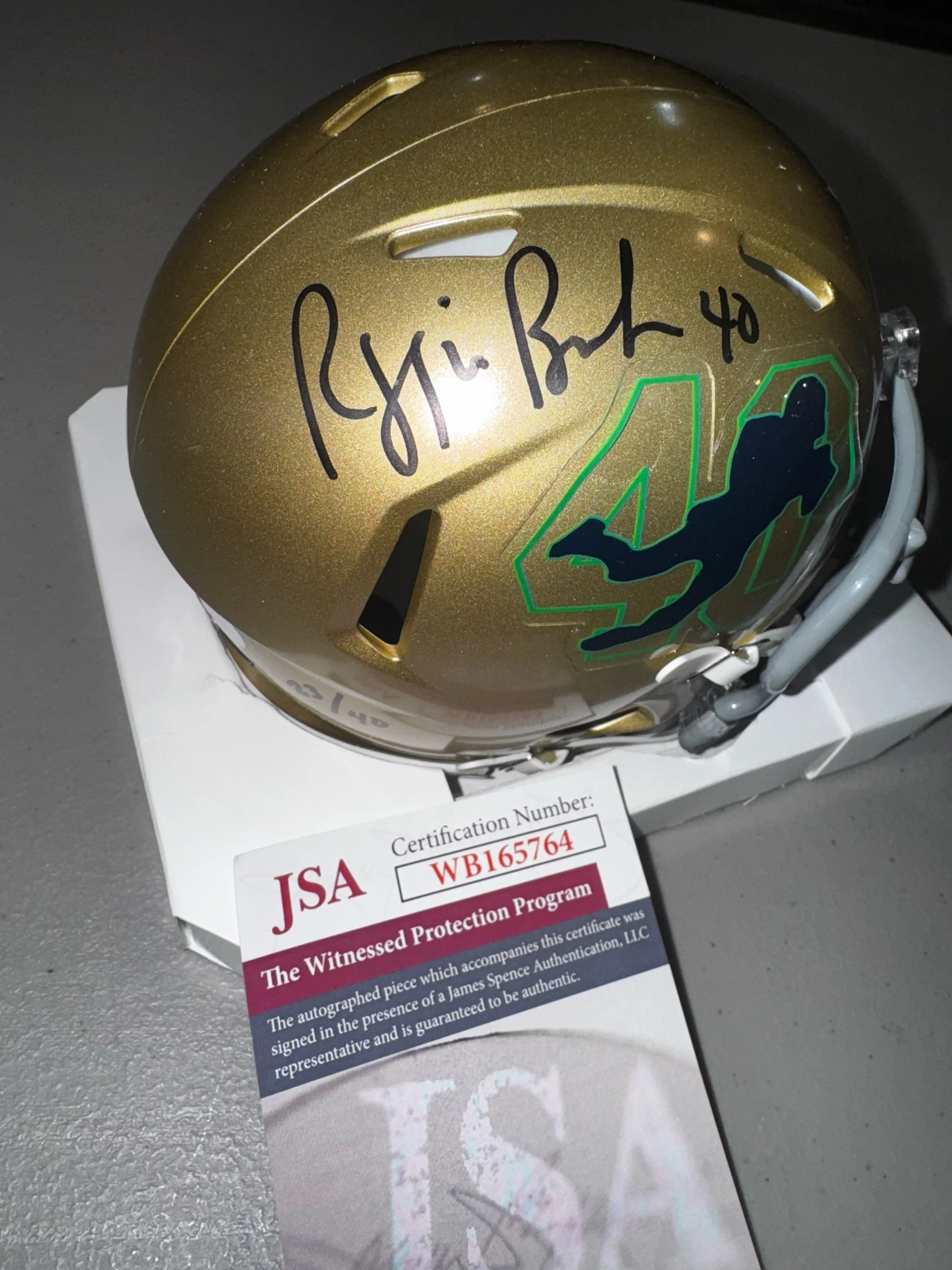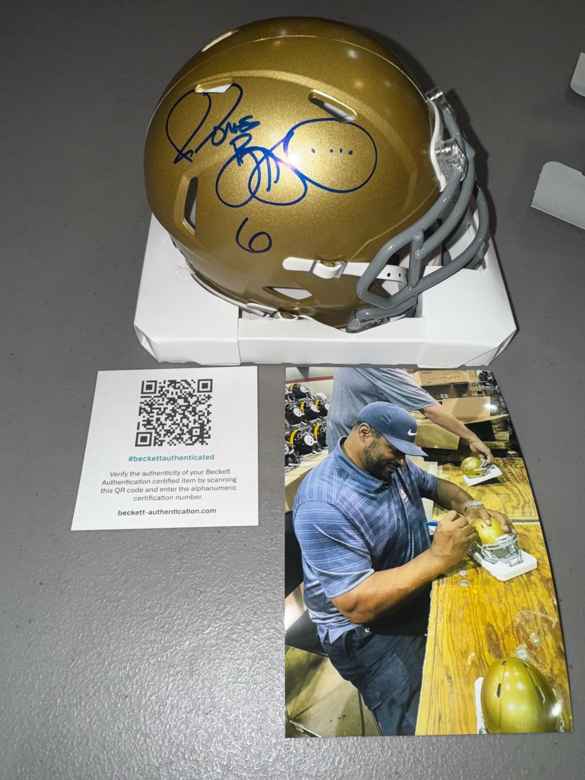 Each Notre Dame football helmet shines with a golden luster, reflecting a legacy of excellence and the unwavering spirit of the Fighting Irish. Online Store Categories: All Signed Notre Dame Full Sized Helmets Famous Notre Dame Artists Clothing Legends of The Game Featured Footballs Helmets Online Store All | Signed Notre Dame Full Sized Helmets | Famous Notre Dame Artists | Clothing | Legends of The Game | Featured | Footballs | Helmets | Notre Dame football Mini Helmet signed Marcus Freeman w COA $225.00 Full Size Replica Notre Dame football helmet signed Rudy Ruettiger inscribed w COA $350.00 Marcus Freeman Signed 11x17 inch Photo coa $185.00 Game Used Notre Dame Football Signed Lou Holtz $485.00 Notre Dame Play Like A Champion Today metal sign Signed Laurie Wenger $30.00 Notre Dame Football Mini Helmet Signed Joe Montana COA $350.00 Notre Dame football Mini helmet signed Jerome Bettis COA $350.00 Notre Dame Football Mini Helmet Signed Tim Brown COA $265.00 Limited /40 Notre Dame Football Mini Helmet Signed Reggie Brooks COA $185.00 Notre Dame Football Mini Helmet Signed Michael Mayer COA $145.00 Notre Dame Football Mini Helmet Signed Jack Kiser COA $135.00 Sold Out Notre Dame Football Mini Helmet Signed Rocket Ismail COA $185.00 Notre Dame Football Mini Helmet Signed Kyle Hamilton COA $165.00 Sold Out Notre Dame Play Like A Champion Today Mini helmet Signed Laurie Wenger $45.00 Notre Dame Play Like A Champion Today Poster Signed Laurie Wenger $30.00 Notre Dame football mini helmet signed JD Bertrand $115.00 Notre Dame football mini helmet signed Stephon Tuitt JSA COA $85.00 Notre Dame football mini helmet signed Brian Kelly Beckett COA $125.00 Notre Dame football mini helmet signed Julius Jones JSA COA $125.00 Notre Dame football mini helmet signed Equanimeous St. Brown $95.00 Notre Dame football mini helmet signed Jaylen Sneed $125.00 Notre Dame football mini helmet signed Kyle Rudolph $115.00 Notre Dame football mini helmet signed Jimmy Clausen $120.00 Notre Dame football mini helmet signed Gabriel Rubio $85.00 Notre Dame football mini helmet signed Michael Floyd $125.00 VERY RARE: Antique Flesh-Colored Knute Rockne Bust $2,500.00 Bryant Young San Francisco 49ers Team Issued Football Jersey Signed Sale Price: $685.00 Original Price: $785.00 Sale NOTRE DAME HEAD COACH KNUTE ROCKNE LARGE BUST JERRY MCKENNA $12,500.00 Notre Dame Football Movie Rudy Script signed by Rudy Ruettiger $385.00 RARE 1966 NOTRE DAME FOOTBALL VS MICHIGAN STATE FOOTBALL TICKET/PROGRAM $875.00 RARE 2012 Notre Dame Football Wilson Football Dublin Ireland $1,500.00 Rare Framed Notre Dame Four Horsemen Signatures Crowley, Layden, Miller, Stuhldreher. Grantland Rice $5,750.00 Seven Notre Dame Heisman trophy winners ballots $1,250.00 Use team issued Notre Dame baseball cleats, and new gloves $55.00 Used team issue, Notre Dame baseball Bryce Harper under Armour cleats, and New gloves $55.00 Team Issued Notre Dame Football Home Jersey #16 $450.00 Team Issued Notre Dame Football Home Jersey #80 $475.00 2010 Team Issued Notre Dame Football Home Jersey $300.00 Limited Notre Dame football cooperstown Bear. Sale Price: $285.00 Original Price: $300.00 Sale 2010 HARRISON SMITH GAME USED NOTRE DAME FOOTBALL ADIDAS JERSEY HOME STEINER $1,850.00 2009 GAME USED NOTRE DAME FOOTBALL HOME JERSEY STEINER COA JIMMY CLAUSEN $1,500.00 2002 Notre Dame football banner used at the bowl game displayed at the ND ALUMNI ASSOCIATION $170.00 The FOUR WINNERS by KNUTE ROCKNE the story of a great football team signed Jack Rockne $350.00 ALL RISE THE REMARKABLE JOURNEY OF ALAN PAGE BY BILL MCGRANE SIGNED ALAN PAGE $250.00 GOD, COUNTRY, NOTRE DAME THE AUTOBIOGRAPHY OF THEODORE M. HESBURGH WITH JERRY REEDY $225.00 Sold Out Notre Dame Where have you gone? Signed Author Eric Hansen & Robin Weber $125.00 Sold Out TRAVELS WITH TED & NED THEODORE M. HESBURGH EDITED BY JERRY REEDY SIGNED $125.00 University of Notre Dame Aerial Photo matted Cartier Field $195.00 1996 Tracy Stouffer University of Notre Dame Framed picture $185.00 Rare 2012 Team issued Notre Dame Football Shamrock Series Helmet $10,500.00 Wild Sports 5501-ND NCAA Notre Dame Fighting Irish Leather Office Chair $585.00 Sold Out Circa 1990s Notre Dame Football Jersey #40 $325.00 Circa Early 2000s Notre Dame Football Jersey #1 $325.00 Circa 1990s Notre Dame Football Jersey #5 $325.00 Authentic 1923 Notre Dame Football vs Purdue Football Ticket stub $2,750.00 Authentic 1930 Notre Dame Football vs University of Southern California Football Ticket stub $1,500.00 1927 Notre Dame Football vs USC Football Ticket Authentic $1,350.00 Notre Dame Football Replica Jersey Signed Kyle Rudolph COA $145.00 Notre Dame Football Replica Jersey Signed Kory Minor Sale Price: $125.00 Original Price: $155.00 Sale Notre Dame Football Replica Jersey Signed Wes Pritchett COA $125.00 Rare Original Jim Wainwright Notre Dame Painting Signed $3,500.00 Authentic Notre Dame Football Stadium Brick $265.00 Rare Notre Dame and St Mary’s Music Sheet Sale Price: $165.00 Original Price: $185.00 Sale Notre Dame Baseball Full Size Helmet Signed by Jeff Samardzija $1,200.00 Rare Jeff Samardzija football/baseball Bobblehead Sale Price: $185.00 Original Price: $225.00 Sale NOTRE DAME FOOTBALL MINI HELMET SIGNED Drayk Bowen COA $165.00 Original Notre Dame football 1927 team photo Knute Rockne Head Coach $2,850.00 Original Notre Dame football 1926 team photo Knute Rockne Head Coach Sale Price: $1,850.00 Original Price: $1,950.00 Sale Notre Dame football coach LOU HOLTZ STATUE with box $350.00 Notre Dame football coach Ara Parseghian bobble head with box $450.00 Sold Out Notre Dame football mini helmet signed Ryan Grant $125.00 Notre Dame Stadium Commemorative coin First game Georgia Tech 1997 $85.00 Vintage Notre Dame Tie Clasp 1950s or 60s $125.00 Vintage Notre Dame Tie Clasp 1950s $125.00 Notre Dame Football Full Size Four Horsemen logo $110.00 NOTRE DAME SOUTH BEND by SOUTH SHORE LINE Copy Poster $125.00 Notre Dame football Varsity C